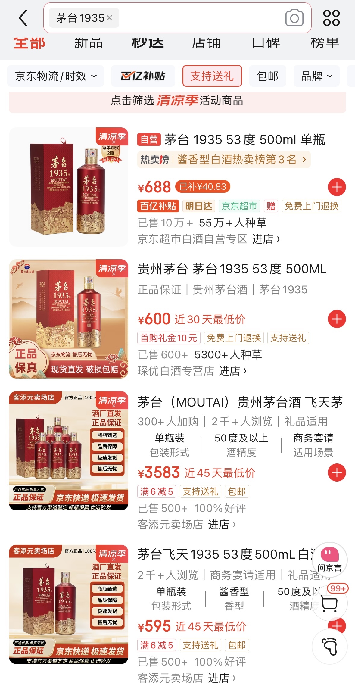 在淘宝和京东等电商平台,南方+记者看到,在“京东超市白酒自营专区”,茅台1935 500ml百亿补贴后售价每瓶688元。而在其他非自营店,售价更低,茅台1935有单瓶售价600元的,也有一箱6瓶3583元的。