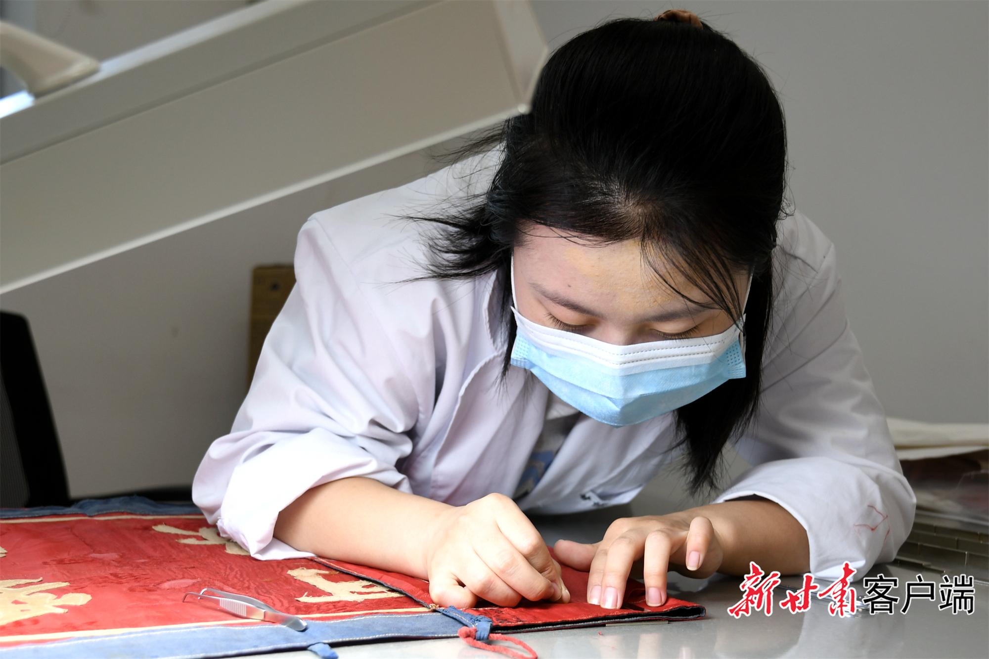 推开甘肃省博物馆文物保护中心修复室的门,一股淡淡的陈旧气息夹杂着特殊的修复材料味道扑面而来。甘肃省博物馆文物保护修复中心馆员伏妍亭俯身在工作台前修补着一面革命锦旗。