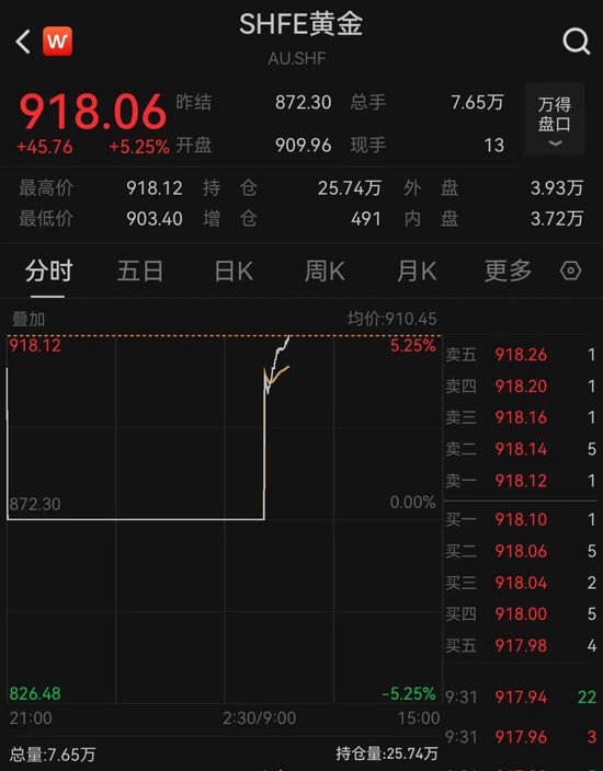 此外,沪金期货主力合约日内涨幅也持续扩大,截至发稿,涨超5%,报918.06元/克,续创新高。