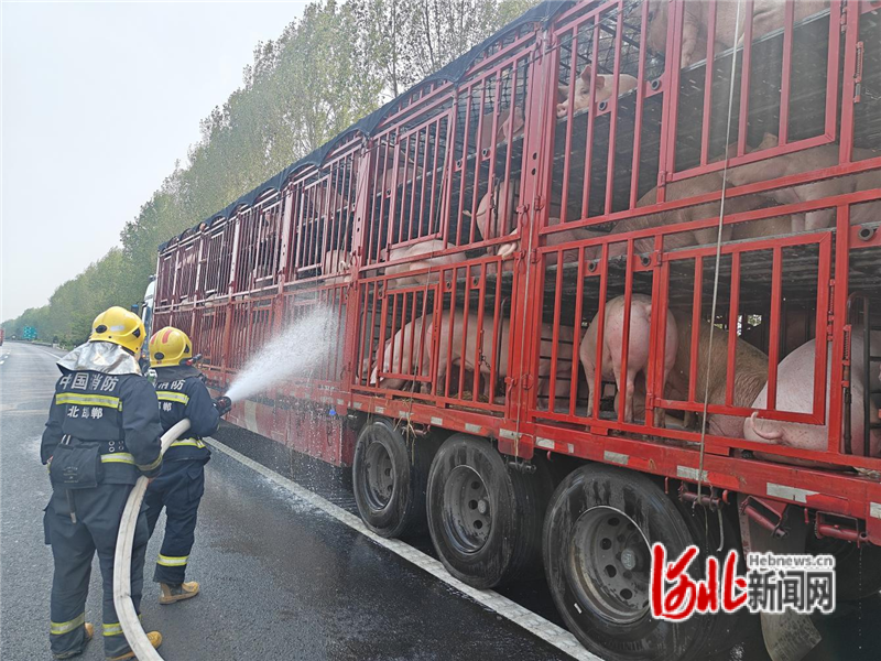 河北新闻网讯(张盼盼)6月13日15时20分,大名县消防救援大队接到报警贵海国际,一辆载有180余头生猪的货车在大广高速铺上收费站附近,因高温天气导致车上生猪出现中暑现象,急需救援。
